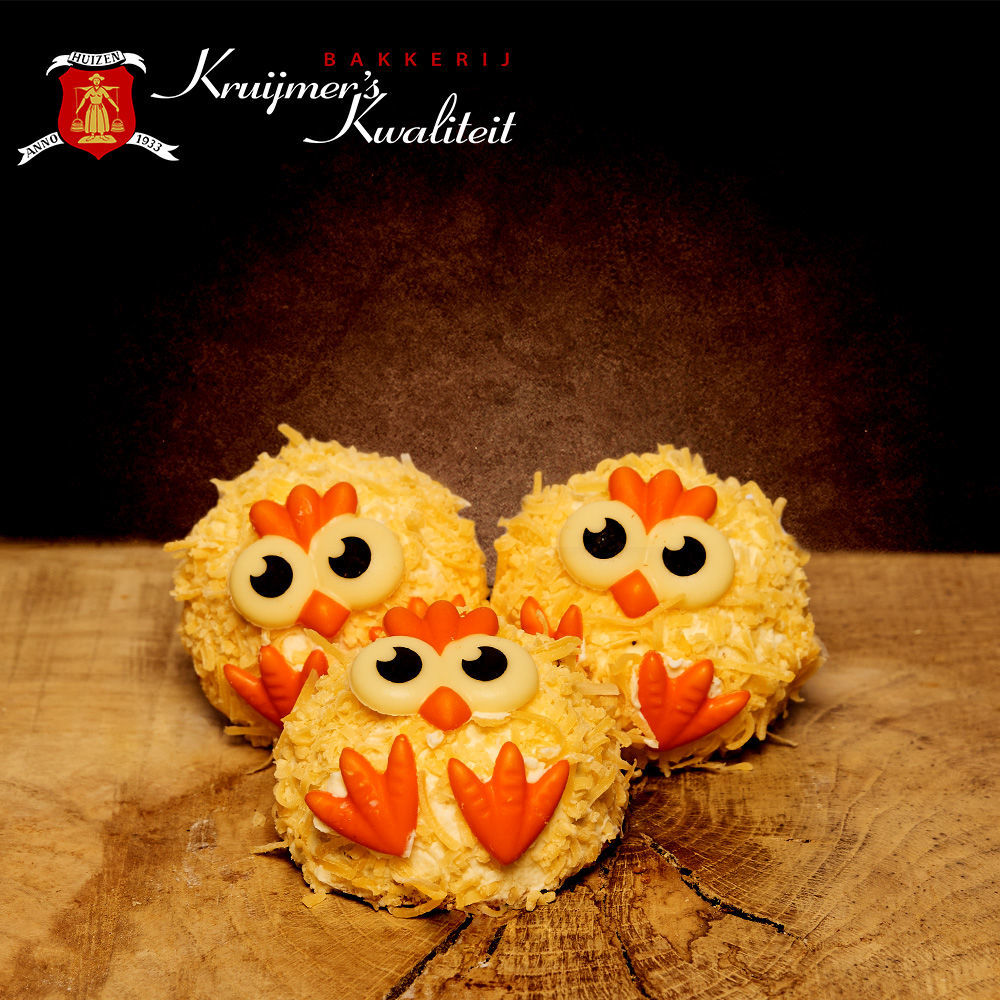 Kuikens gevuld met een laagje cake en creme met stukjes perzik erin.